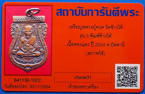 เหรียญหลวงปู่ทวด วัดช้างให้ รุ่น 3 พิมพ์ช้างให้ เนื้อทองแดง ปี 2504 จ.ปัตตานี พร้อมบัตรรับรองสถาบันการันตีพระ