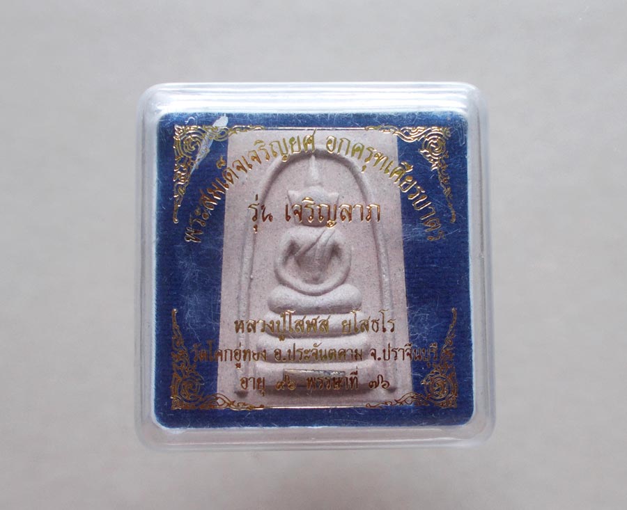 พระสมเด็จเจริญยศ อกครุฑเศียรบาตร รุ่นเจริญลาภ หลวงปู่โสฬส วัดโคกอู่ทอง จ.ปราจีนบุรี เนื้อผงมวลสาร ตะกรุดเงิน ยิงเลเซอร์โค๊ต ยันต์และหมายเลข พร้อมกล่องเดิม