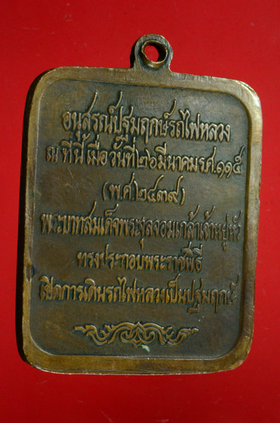 เหรียญ อนุสรณ์ปฐมฤกษ์รถไฟหลวง เมื่อวันที่ ๒๖ มีนาคม รศ.115 (พ.ศ.2439) รัชกาลที่๕ ทรงประกอบพระราชพิธีเปิดการรถไฟหลวงเป็นปฐมฤกษ์ เหรียญรุ่นนี้ออกปี พ.ศ.2520 หลวงพ่อเกษม เขมโก ปลุกเสก |