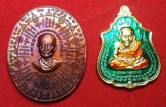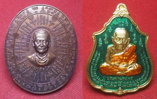 เหรียญหลวงปู่ทวดแสนคาถาล้านอาคม รุ่น อุดมโภคทรัพย์ เนื้อนวะ + เหรียญหลวงปู่ทวด รุ่น ประทานทรัพย์ เนื้อทองแดงกะไหล่ทองลงยา วัดจตุธาตุธาราม จ.ขอนแก่น ปี พ.ศ.2558