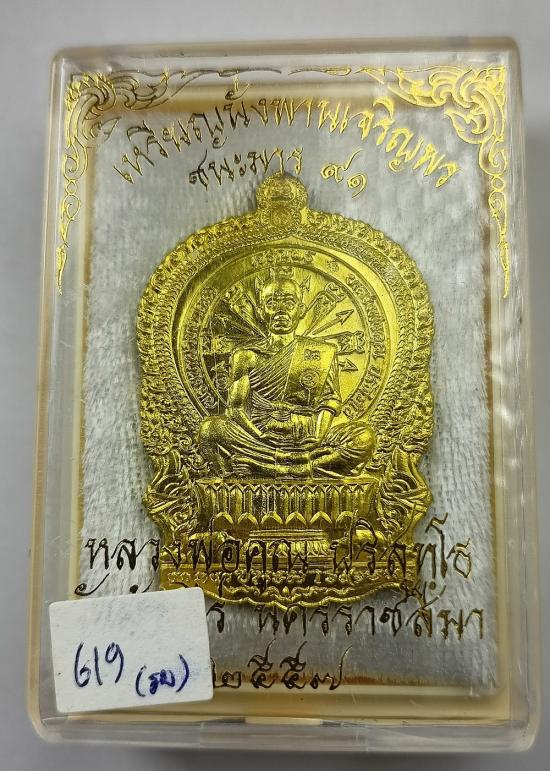 เหรียญนั่งพาน ชนะมาร91 หลวงพ่อคูณ วัดบ้านไร่ เนื้อทองฝาบาตร(ตอกแจก หลังยันต์) เบอร์ 619 พร้อมกล่องครับ