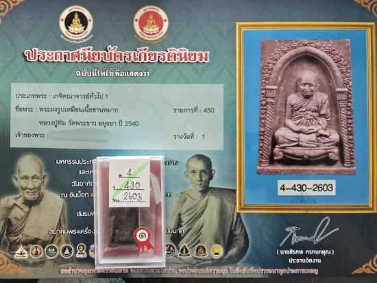 พระผงรูปเหมือนเนื้อชานหมาก หลวงปู่ทิม วัดพระขาว อยุธยา ปี 2540 สภาพสวยติดรางวัล องค์แชมป์ พร้อมใบประกาศ