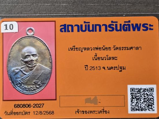 เหรียญหลวงพ่อน้อย วัดธรรมศาลาปี2513 เนื้อนวะ หายากครับ พร้อมบัตรรับรอง