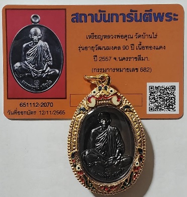 เหรียญหลวงพ่อคูณ รุ่น อายุวัฒนมงคล 90 ปี เนื้อทองแดง ปี 2557 กรรมการ หมายเลข 682 |