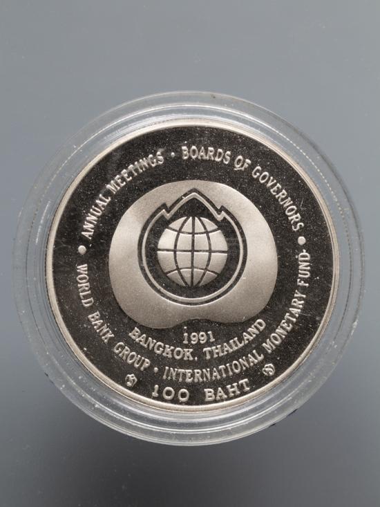 เหรียญ 100 บาท นิเกิลขัดเงา World Bank ที่ระลึกการประชุมสภาผู้ว่าการธนาคารโลก และกองทุนการเงินระหว่างประเทศ พ.ศ.2534 พร้อมกล่องหนังกำมะหยี่สวยหรู เคาะเดียวส่งด่วนฟรี |