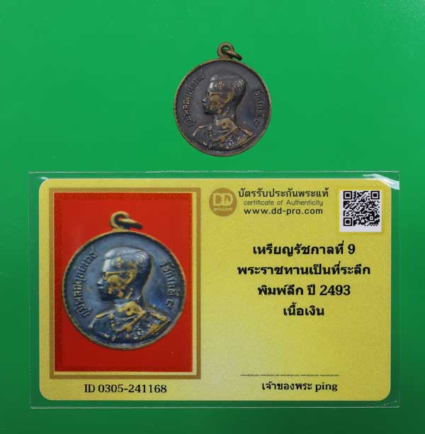 วัดใจ *-* เหรียญพระราชทาน ในหลวงรัชกาลที่ 9 ปี 2493 พิมพ์ 9 หางยาว เนื้อเงิน พร้อมบัตรรับรอง