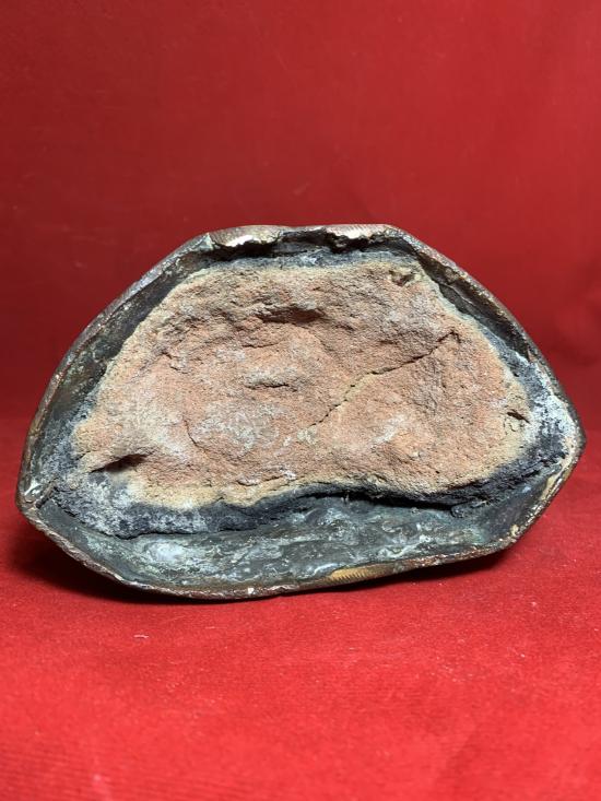 พระบูชารัชกาล เนื้อแดง ฐานดินไทย หน้าตักประมาณ 4 นิ้วหย่อนนิด ปลายเกศหักตามรูป เคาะเดียวเบาๆ |