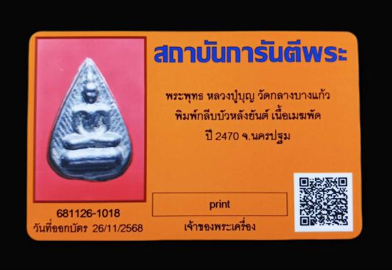 พระกลีบบัวหลังยันต์ เนื้อเมฆพัด หลวงปู่บุญ วัดกลางบางแก้ว จ.นครปฐม พ.ศ. 2470(อายุเกือบ 100 ปี) พร้อมบัตรรับรอง ครับ