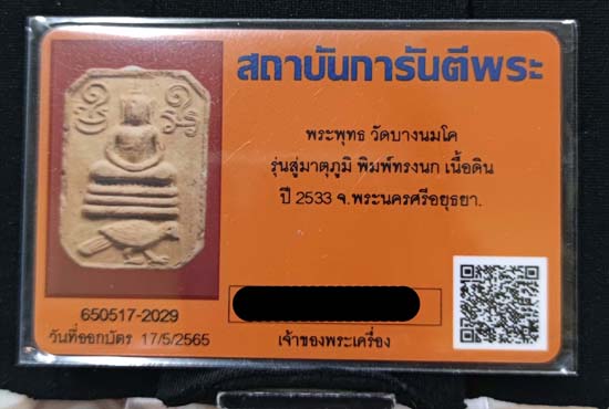 หลวงพ่อปาน วัดบางนมโค พิมพ์ทรงนก รุ่นสู่มาตุภูมิ เนื้อดินอุดผง ปี2533 พร้อมบัตรการันตีพระ พระแท้ดูง่าย