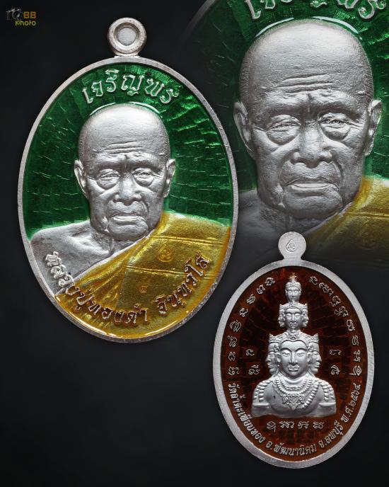 เหรียญเจริญพรมหาเศรษฐี รุ่นฉลองอายุ90 ปี เนื้อเงินลงยาสีเขียวหลังสีแดง สร้าง 10 เหรียญ ปี2564 หลวงปู่ทองดำ วัดถ้ำตะเพียนทอง จ. ลพบุรี