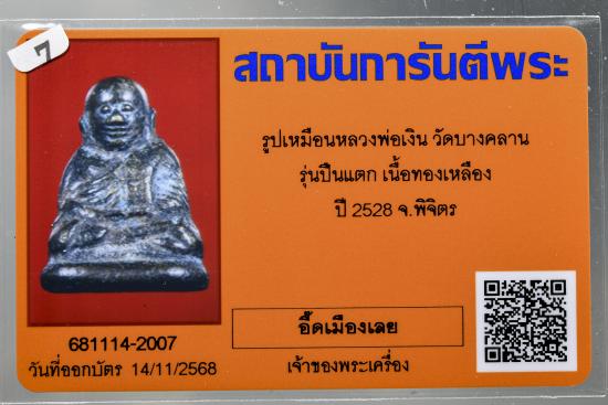 พระรูปหล่อโบราณ หลวงพ่อเงิน วัดบางคลาน รุ่นปืนแตก พิมพ์เศียรกลม หน้านิยม เนื้อเก่า พ.ศ.2528 พร้อมบัตรรับรอง