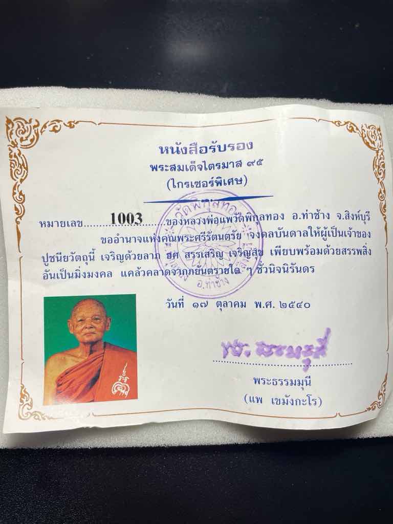800.- พระสมเด็จไตรมาส 95 หลวงพ่อแพ วัดพิกุลทอง จ.สิงห์บุรี ไกรเซอร์พิเศษ ปี 2540 ฝัง ตะกรุดทองคำ 3 ดอก ,โรยเกศาและผงตะไบทองคำ ตอกเลข สวยเดิมคากล่อง พร้อมบัตรรับรอง จากวัด |
