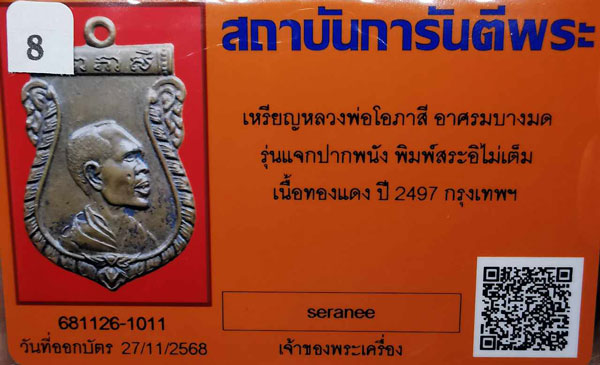 เหรียญหลวงพ่อโอภาสี อาศรมบางมด รุ่นแจกปากพนัง พิมพ์สระอิไม่เต็ม เนื้อทองแดง ปี2497 จ.กรุงเทพฯ + บัตรG-pra สภาพเดิมค่ะ