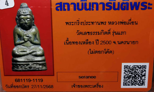 พระกริ่งประธานพร หลวงพ่อเผื่อน วัดเลขธรรมกิตติ์ รุ่นแรก เนื้อทองเหลือง กริ่งดัง ปี2500 จ.นครนายก(ไม่ตอกโค้ด) + บัตรG-pra สภาพเดิมค่ะ สภาพตามรูปทุกประการค่ะ