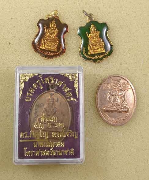 เหรียญพระพรหม อ.ทองแถม ศาสตระรุจิ อาจารย์ใหญ่ในสายวิชาการพรหมศาสตร์ 2 เหรียญ + เหรียญบรมครูศาสตร์ ดร.ภิญโญ พงษ์เจริญ + เหรียญบรมครูปู่เจ้าสมิงพราย