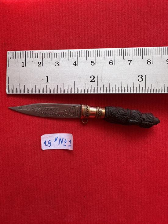 มีดหมอสาริกา หลวงพ่อพัฒน์ วัดห้วยด้วน รุ่นสุดท้ายปี 2566 ขนาด 1.5 นิ้วใบมีดลายเสมาเต็มใบ กลั่นไม้มะค่า ด้ามแกะท้าวเวสสุวรรณ #1