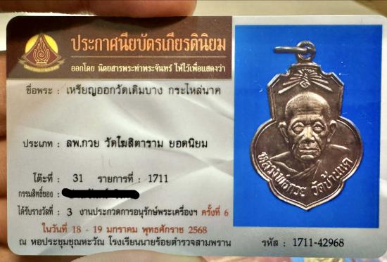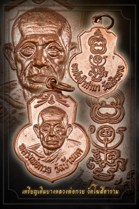 เหรียญหลวงพ่อกวย ออกวัดเดิมบางนางบวช สร้างขึ้นในปี พ.ศ.๒๕๑๓ เป็นเหรียญรูปโล่ฝรั่ง รูปทรงสวยงาม ด้านหน้าเหรียญ รูปหลวงพ่อเป็น รูปครึ่งองค์ดูสวยงามเพราะช่างแกะรูปหลวงพ่อ ได้เหมือนมาก ๆ ด้านล่างมีตัวอักษรเขียนว่า หลวงพ่อกวย ชุตินฺโร ด้านหลังมียันต์ ๒ ตัว คือยันต์เฑาะ และยันต์นะโมพุทธายะ ด้านล่างเขียนว่า ยกช่อฟ้าศาลาวัดเดิมบาง จำนวนการสร้างประมาณ ๒ หมื่นเหรียญ มี ๒ แบบ คือ รมดำกับกะไหล่นาค (รมนาคหายากกว่า)ทั้ง๒แบบยังแบ่งย่อยอีก๒พิมพ์คือ พิมพ์ไหล่จุดหูขีด และพิมพ์ไหล่จุด แต่พิมพ์ไหล่จุดหูขีดหรือพิมพ์นิยมจะหายากกว่าและราคาสูงกว่าพิมพ์ไหล่จุดแต่ก็เข้าพิธีเดียวกันปลุกเสกพร้อมกันนะครับ |