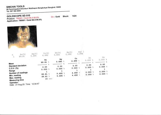 องค์พระน้ำหนักประมาณ 8.7 g ทำจากทองคำ 89.81 % อ้างอิงจากใบตรวจ%ทอง จากเครื่องตรวจเปอร์เซ็นต์ทอง