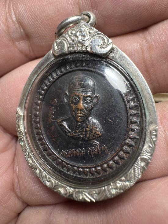 เหรียญ หลวงพ่อเกษม เขมโก รุ่น ศาลากลาง สุสานไตรลักษณ์ จ.ลำปาง ปี ๒๕๑๗ เนื้อทองแดงรมดำ + เลี่ยมเงิน เดิมๆ