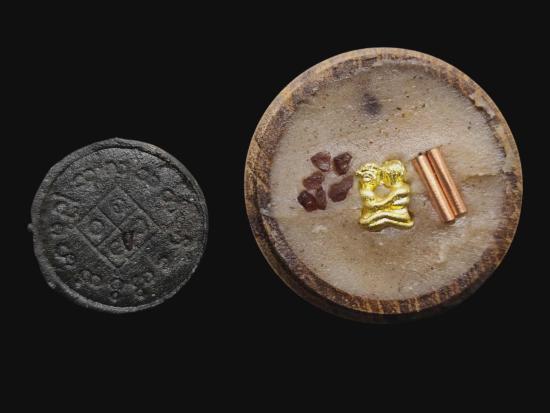 เคาะเดียวแดง พญายูงคำ รุ่นแรก เนื้อดำปัดทอง และ ตลับไม้สีผึ้งเนื้อหอม รังผึ้งร้าง ขวางเดือนขวางตะวัน รุ่นแรก ฝังอิ่น ตะกรุด ในเมตตาบารมี เจ้าปู่จั่นต่า กาวิสาละ ครูบากฤษดา เมตตาเษก |