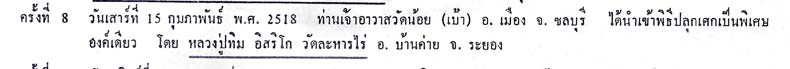 2.ในใบฝอยของพระแต่ละองค์ ซึ่งพระองค์นี้เดิม ๆ สมบูรณ์มากมีใบฝอยเดิมให้ไปด้วย ก็ระบุไว้ว่าหลวงปู่ทิม ได้ปลุกเสกเมื่อวันที่ ๑๕ กุมภาพันธ์ พ.ศ.๒๕๑๘ เช่นเดียวกันครับผม