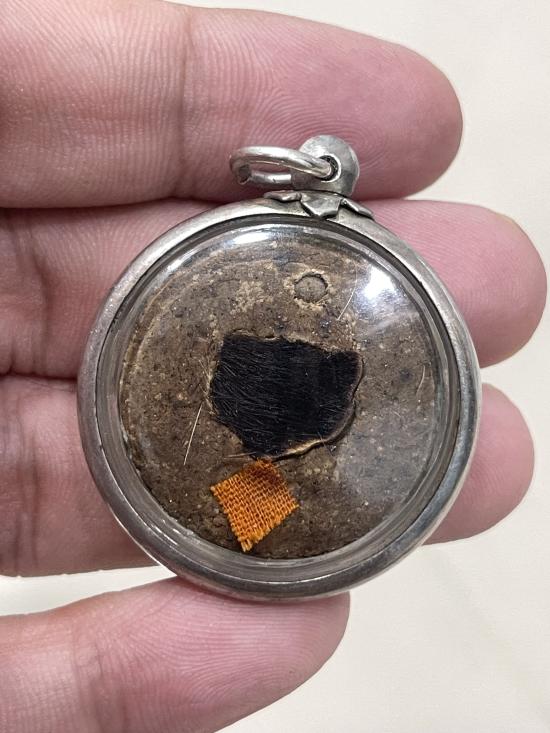 ล็อคเก็ตรุ่นแรกผงฤาชาโชคหลังอุดผงหน้าผากเสือหลวงปู่หงษ์ พรหมปัญโญ สุสานทุ่งมน จ.สุรินทร์สร้างปี2549 พร้อมเลี่ยมเงินผ่าหวาย
