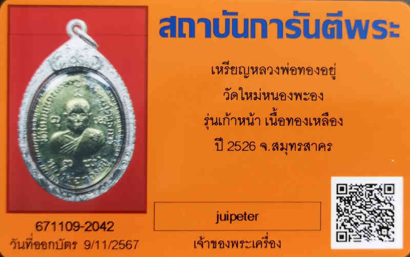 เหรียญหลวงพ่อทองอยู่ วัดใหม่หนองพะอง รุ่นเก้าหน้า เนื้อทองเหลือง ปี 2526 จ.สมุทรสาคร พร้อมบัตรการันตรีพระ