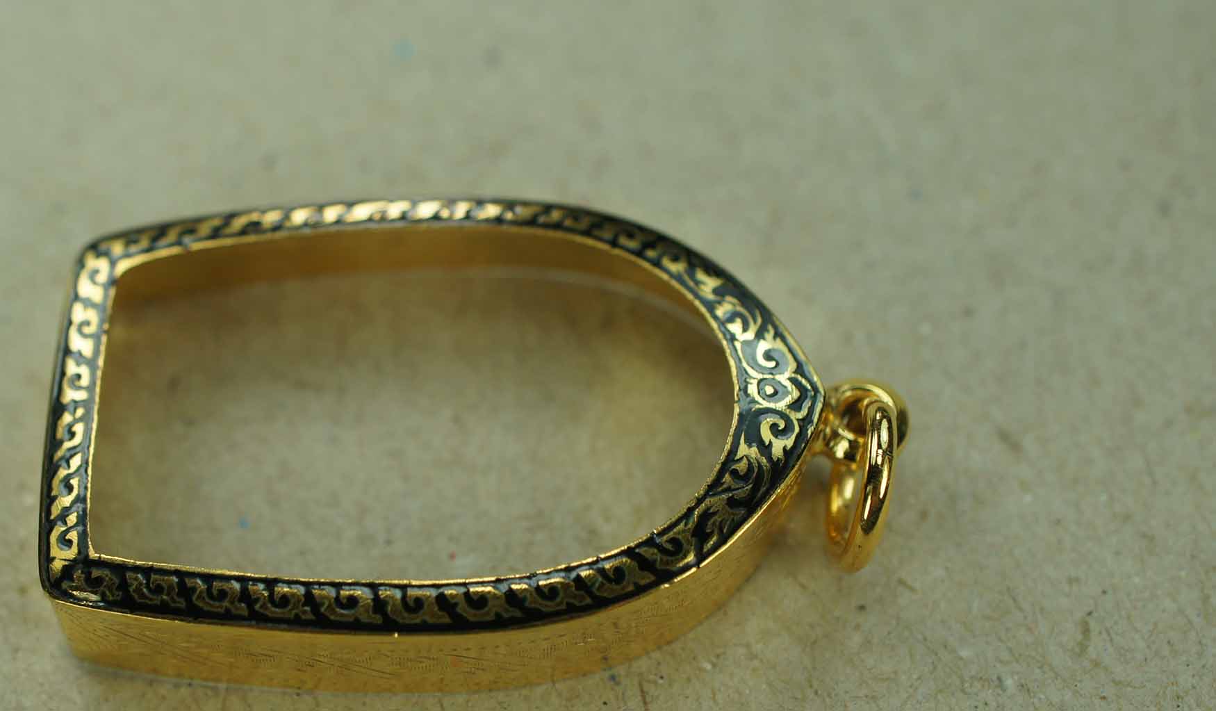 กรอบทอง ลงยาดำ ข้างแกะลาย (ตรง Size ) ใส่ ท้าวเวสสุวรรณ หลวงพ่อทองสุข หรือ หนุมาน หลวงปู่ทิม วัดละหารไร่ ขนาดวัดจากขอบด้านใน สูง 3.2 Cm. กว้างฐานล่าง 1.7 Cm. งานขึ้นมือ น้ำหนัก 3.05 กรัม เปอร์เซ็นต์ทอ