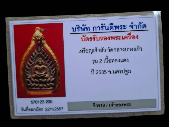 เหรียญเจ้าสัว 2 เนื้อทองแดง เลี่ยมทอง ปี2535 วัดกลางบางแก้ว เหรียญนี้พิมพ์คมชัด องค์จริงผิวสวยมากครับ พร้อมบัตรรับรองครับ
