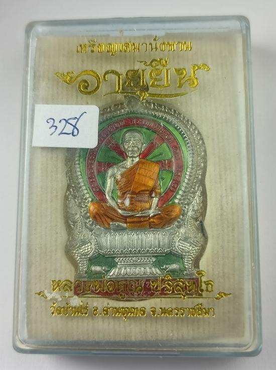 เหรียญนั่งพานอายุยืน (หลังหนุมาน รุ่นแรก) หลวงพ่อคูณ วัดบ้านไร่ เนื้ออาปาก้าลงยา3สี(แยกชุดพระบูชานวะหน้าตัก18นิ้ว) เบอร์ 328 พร้อมกล่องครับ