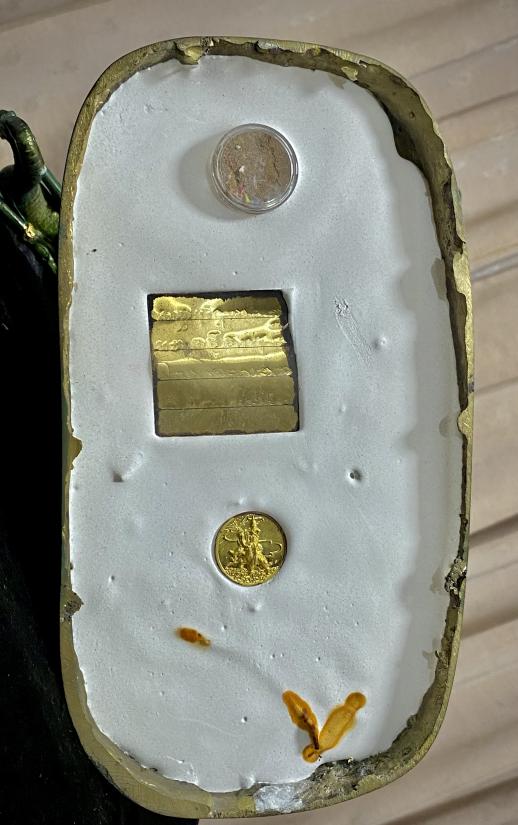 ใต้ฐานบรรจุ มวลสาร แผ่นยันต์หัวใจพระอินทร์ เหรียญโชคดี