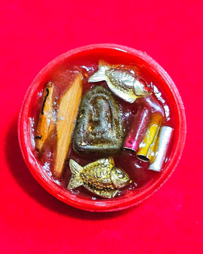 ตลับสีผึ้งมหาเสน่ห์หลวงพ่อกวย วัดโฆสิตาราม จ.ชัยนาท ออกจากวัด ปี2521 หลังเลข 1 ในงานผูกพัทธสีมา วัดโฆสิตาราม ด้านในประกอบไปด้วย ปลาตะเพียนเงิน ตะเพียนทอง ,นกสาริกาไม้แกะ , ตระกรุดสามกษัตริย์ และ แม่นางกวักใบมะขามเนื้อชิน (ฝังลงไปในเนื้อสีผึ้ง) สีผึ้งยังอยู่สมบูรณ์ จัดเป็นของดีของท่านที่น่าใช้มากครับ ของขลังมหาเสน่ห์อัดแน่นเต็มตลับ ชิ้นนี้ใต้ตลับเลข 1 ตัวจริงครับ ฝาปิดเดิมๆ ตลับมีทั้งแบบที่ใต้ตลับ มี เลข 1 ,พรพรหม และ แบบเรียบๆครับ น่าเก็บสะสมไว้บูชาครับ แม้ว่าตลับสีผึ้งนี้จะเป็นยุคปลายของท่านนะครับ เป็นของที่ทางวัดสั่งมาให้หลวงพ่อปลุกเสก แต่ลูกศิษย์ลูกหาผู้ที่ได้ครอบครองต่างหวงแหนกันมาก เรื่องพุทธคุณ "เมตตามหานิยม" ครบเครื่องครับ