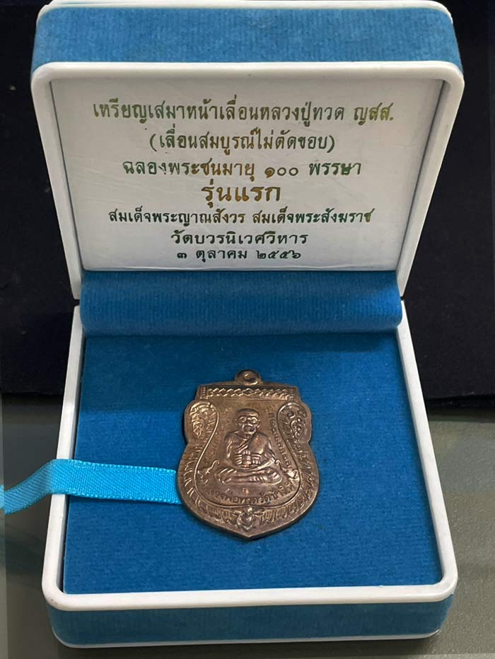 เหรียญเสมาหน้าเลื่อนหลวงปู่ทวด ญญส. (เลื่อนสมบูรณ์ไม่ตัดขอบ) ฉลองพระชนมายุ 100 พรรษา เนื้อมหาชนวน ตอกโค๊ด ปี 2556 กล่องเดิม