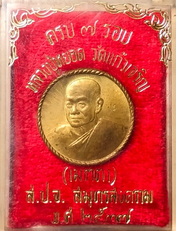 เหรียญครบ 7 รอบ หลวงปู่หยอด วัดแก้วเจริญ จังหวัดสมุทรสงคราม ปี 37