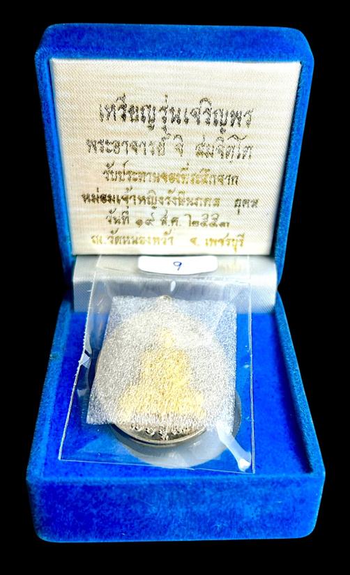 เหรียญเจริญพร (บน) พระอาจารย์จิ วัดหนองหว้า เพชรบุรี (ศิษย์หลวงพ่อยิด วัดหนองจอก) เนื้อเงินหน้ากากทองคำหลังเรียบจาร หมายเลข 9