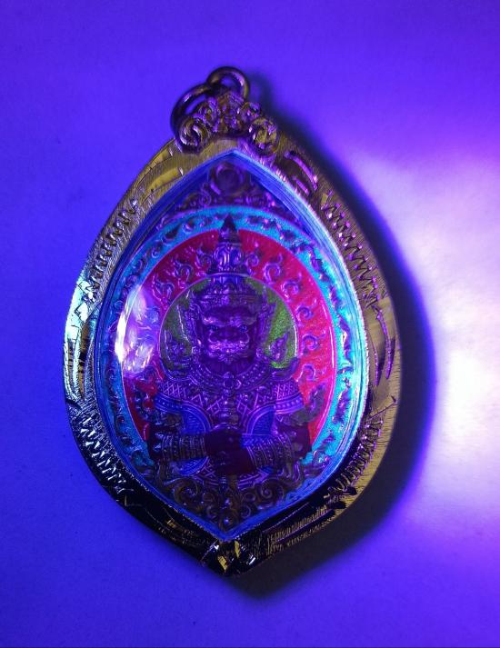 วัดใจเคาะเดียวแดงจ้า เหรียญท้าวเวสสุวรรณ พระอาจารย์เลี้ยง วัดจอมเกษ เนื้อชุบเงินลงยาเรืองแสง เลี่ยมกรอบชุบทอง เคาะเดียวแดงจ้า
