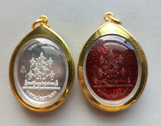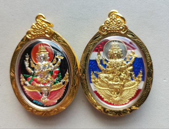 วัดใจเคาะเดียวแดงจ้า เหรียญพระพรหม เนื้อชุบเงินลงยาธงชาติหลังลงยาแดงหน้ากากชุบทอง+เนื้อชุบเงินลงยาดำรัศมีส้ม พระพรหมเพ้นท์ เลี่ยมกรอบชุบทอง หลวงปู่อิ่ม วัดทุ่งนาใหม่ เคาะเดียวแดงจ้า