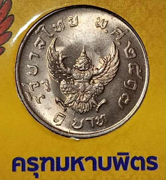 เหรียญ 1 บาท หลังครุฑ พ.ศ.2517 ในสมัยรัชกาลที่ 9 พร้อมการ์ดสีเหลือง พกติดตัวไว้เป็นมงคล เหรียญสภาพไม่ผ่านการใช้งาน ผิวเดิมสวย จำนวน 1 เหรียญ ครับ ((บล็อคเนื้อเกินเป็นเส้นตรงตั้งแต่ตรงลำตัวถึงขอบเหรียญ
