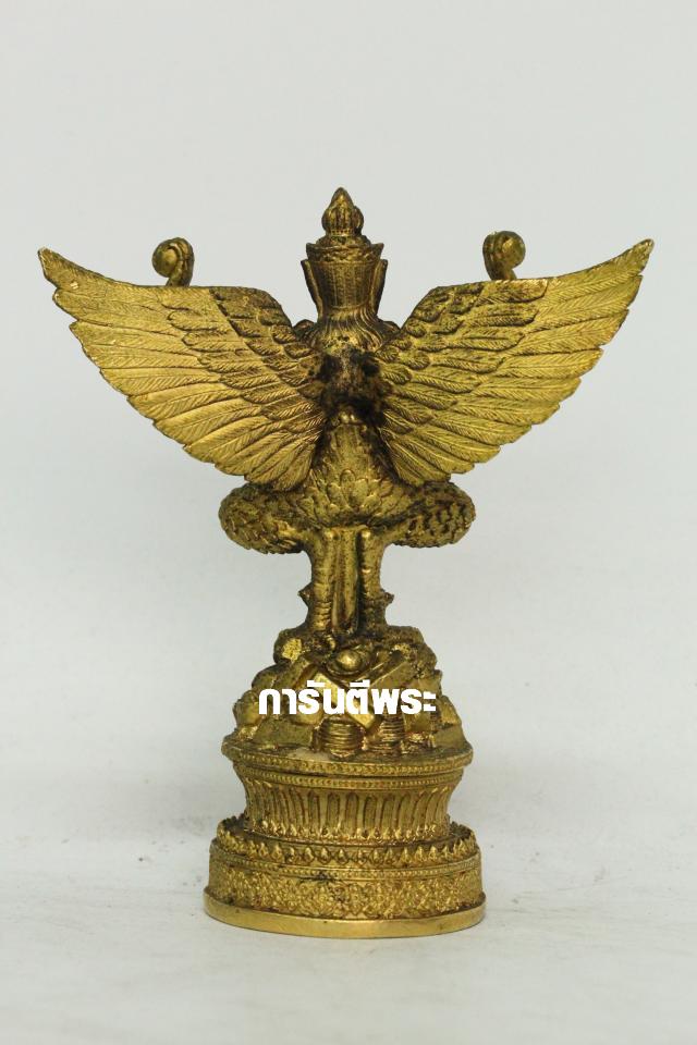 พญาครุฑบูชา พระอาจารย์วราห์ วัดโพธิ์ทอง กรุงเทพมหานคร รุ่นเหยียบเงินเหยียบทอง พิมพ์เล็ก เนื้อทองเหลืองกะไหล่ทอง ปีพ.ศ 2540
