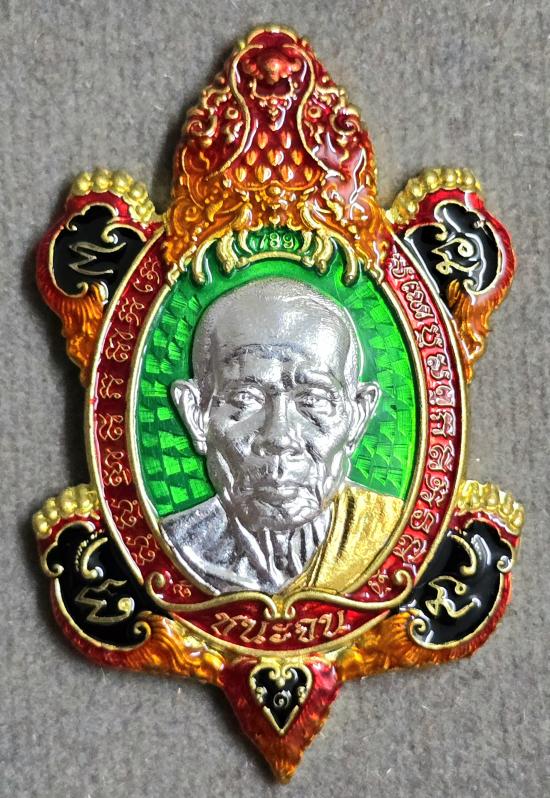 เหรียญพญาเต่าเรือน รุ่น"ชนะจน" หลวงปู่หลิว ปัณณโก วัดสี่แยกเจริญพร นครปฐม เนื้อทองระฆัง หน้ากากเงิน จีวรปิดทอง ลงยาเขียว เต่าไล่สี ขาดำ สวยมาก ตอก"หลิว" หมายเลข ๑๗...พร้อมกล่อง เบาๆเคาะแรกแดง