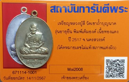 เหรียญหลวงปู่สี วัดถ้ำเขาบุญนาค รุ่นอายุยืน พิมพ์เต็มองค์ เนื้อทองแดง ปี2517 จ.นครสวรรค์ พร้อมบัตรรับรอง