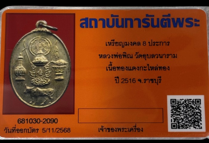 เหรียญมงคล 8 ประการ หลวงพ่อพิน วัดอุบลวนาราม เนื้อทองแดงกะไหล่ทอง ปี 2516