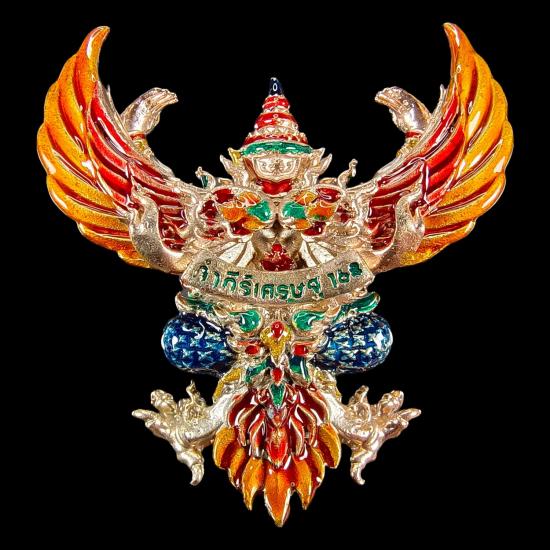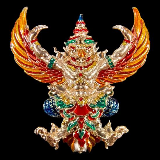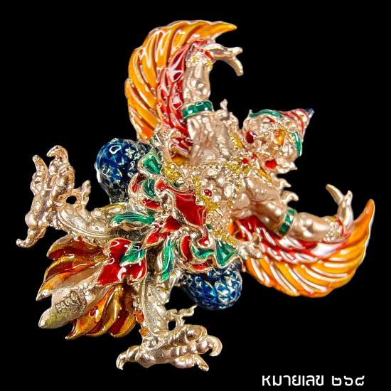 พญาครุฑ ผู้ทรงอิทธิฤิทธิ์ทั่วหล้า ปฐมบทแห่งครุฑ รุ่นคัมภีร์เศรษฐี 168 วัดหนองไผ่ อ.ทับทัน จ.อุทัยธานี เนื้อทองชมพู ลงยาราชาวดี หมายเลข ๒๖๘ พร้อมกล่องเดิม พิมพ์ใหญ่ ขนาดสูง 4 ซม.