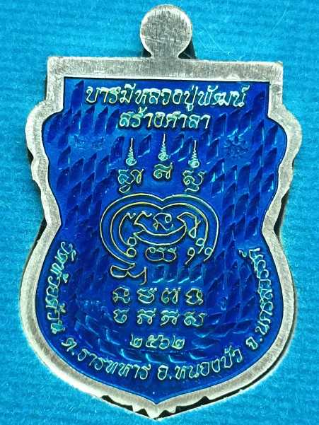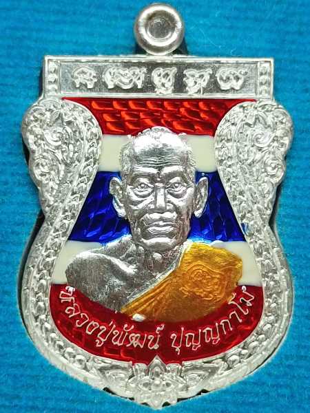 เหรียญบารมีหลวงปู่พัฒน์สร้างศาลา ปี62 หลวงพ่อพัฒน์ วัดห้วยด้วน เนื้อเงินลงยาธงชาติ หลังลงยาฟ้า เลข28