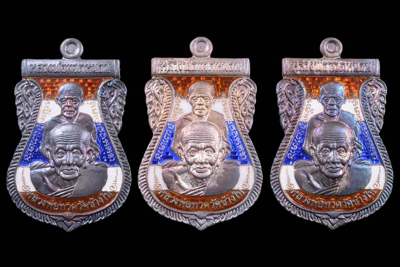 -จำนวน 3 เหรียญ เหรียญหลวงปู่ทวด อาจารย์ทอง วัดสำเภาเชย พิมพ์พุทธซ้อน รุ่นพระธาตุเจดีย์ เนื้อเงินลงยาลายธงชาติ ปี 2549 จ.ปัตตานี