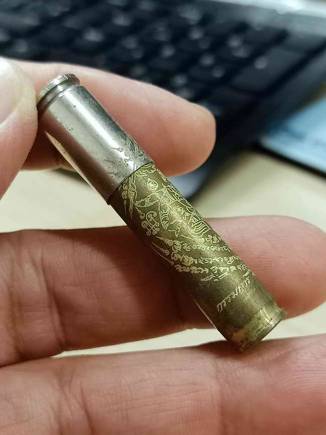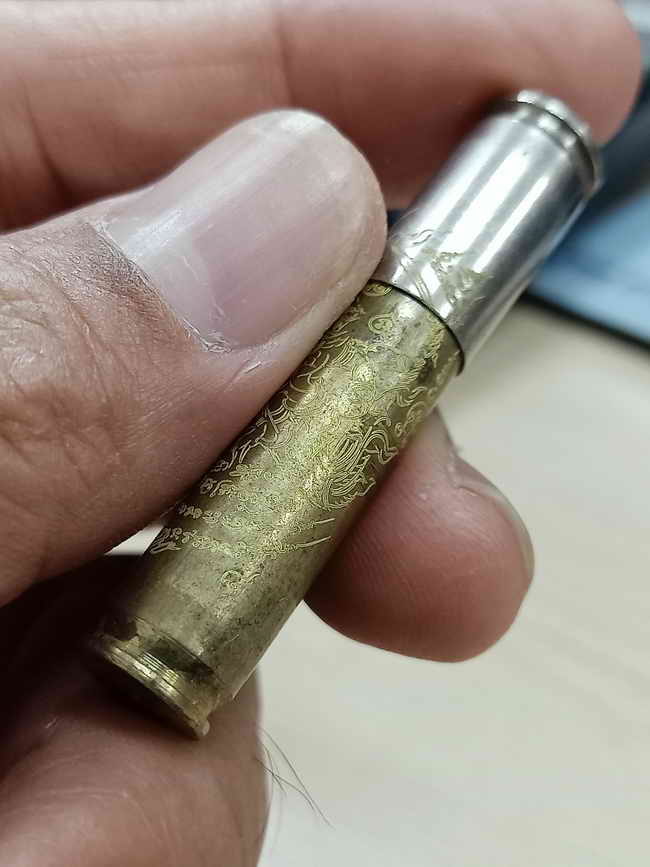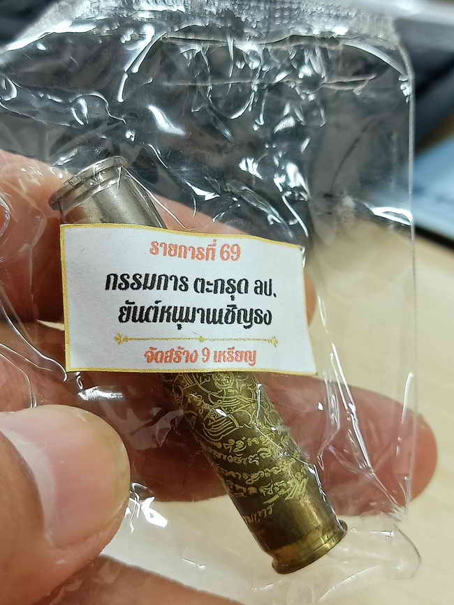 วัดใจ 100 ตะกรุดปลอกลูกปืน ชนะศึก หลวงปู่บุญมา สำนักสงฆ์เขาแก้วทอง จ.ปราจีนบุรี 2568 ปลอกลูกปืน ยันต์หนุมาน หมายเลข 8 สร้าง 9 กล่องเดิม |