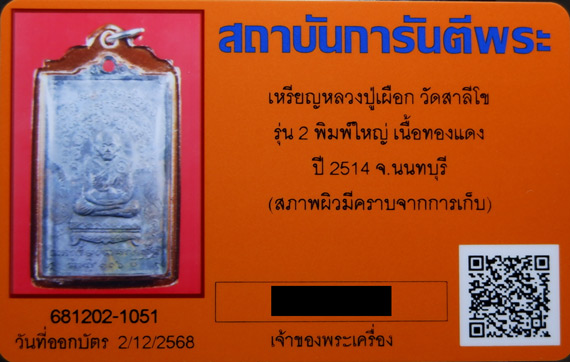 เหรียญหลวงปู่เผือก วัดสาลีโข (พิธี 4 มหาจักร) เนื้อทองแดงรมดำ รุ่น2 ปี2514 พิมพ์ใหญ่ + บัตรรับรอง G-PRA
