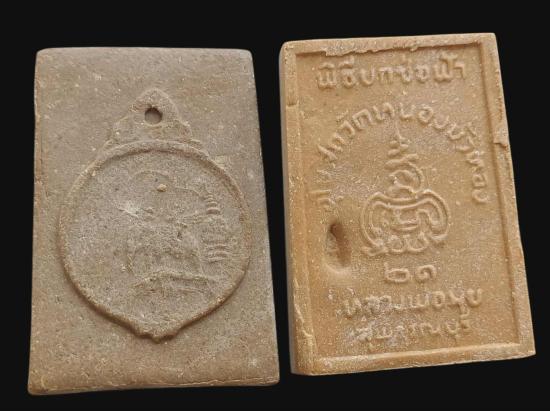 พร้อมกันทีเดียว 2 องค์ครับ พระสมเด็จหลังยุทธหัตถี(พระนเรศวรทรงช้างศึก) หลวงพ่อเก็บ วัดดอนเจดีย์ จ.สุพรรณบุรี ปี พ.ศ.2514 เนื้อผงน้ำมัน+ พระผงรูปเหมือนหลวงพ่อมุ่ย วัดดอนไร่ พิธียกช่อฟ้าอุโบสถวัดหนองบัว
