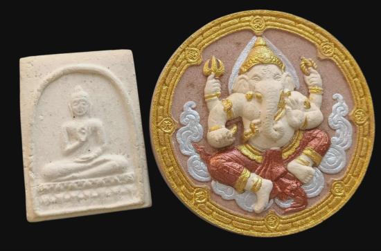 พร้อมกันทีเดียว 2 องค์ครับ พระพุทธนวมินทรมหาจักรี พระมหาธาตุเจดีย์ดอยอินทนนท์ จ.เชียงใหม่ จัดสร้างโดยกองทัพอากาศ ปี2530 พร้อมกล่องเดิม สมเด็จพระญาณสังวร วัดบวรนิเวศ หลวงปู่ครูบาอิน อินโท หลวงพ่ออุตตมะ วัดวังก์วิเวการาม ครูบาชัยวงศ์ วัดพระบาทห้วยต้ม หลวงปู่คำพันธ์ โฆสปัญโญ หลวงปู่เปลี่ยน ปัญญาปทีโป หลวงพ่อไพบูลย์ สุมังคโล และพระเถราจารย์ร่วมปลุกเสกหลายท่าน ร่วมอธิญานจิต + พระพิฆเนศ รุ่นขอได้ดังใจหวัง ปี 2550 วัดพระบาทบางแฟน จ.เชียงใหม่ สวยๆกล่องเดิมครับ