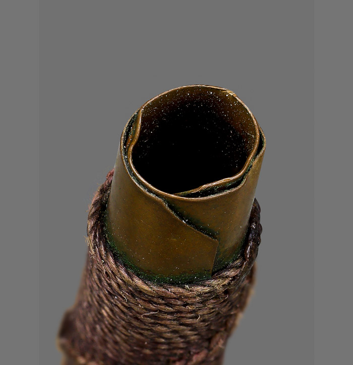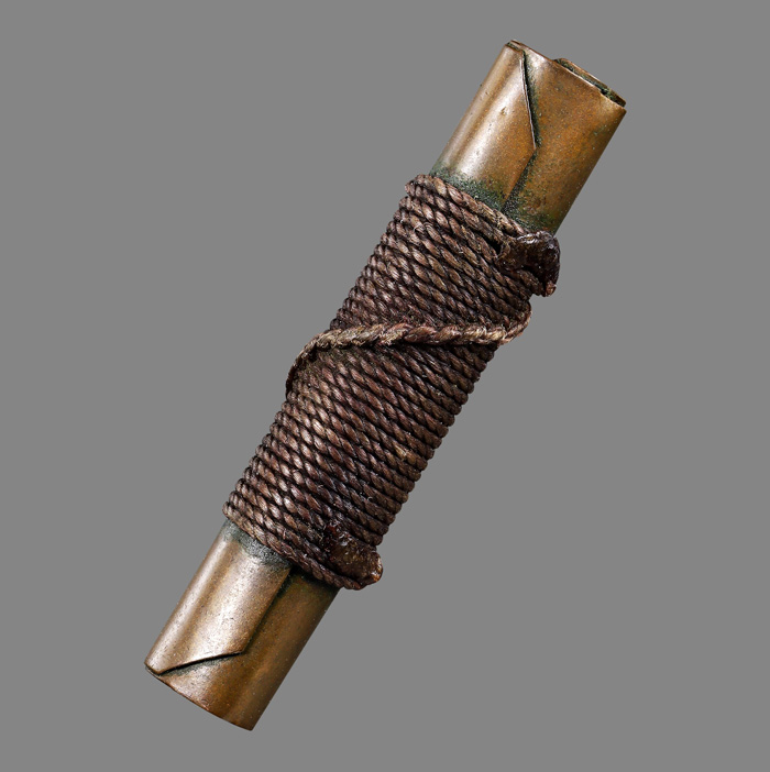 ตะกรุดสาริกา (ไม่ทราบที่) เนื้อทองแดง ถักเชือกเก่ามีอายุ ขนาดตะกรุดยาว 1.45 นิ้ว |